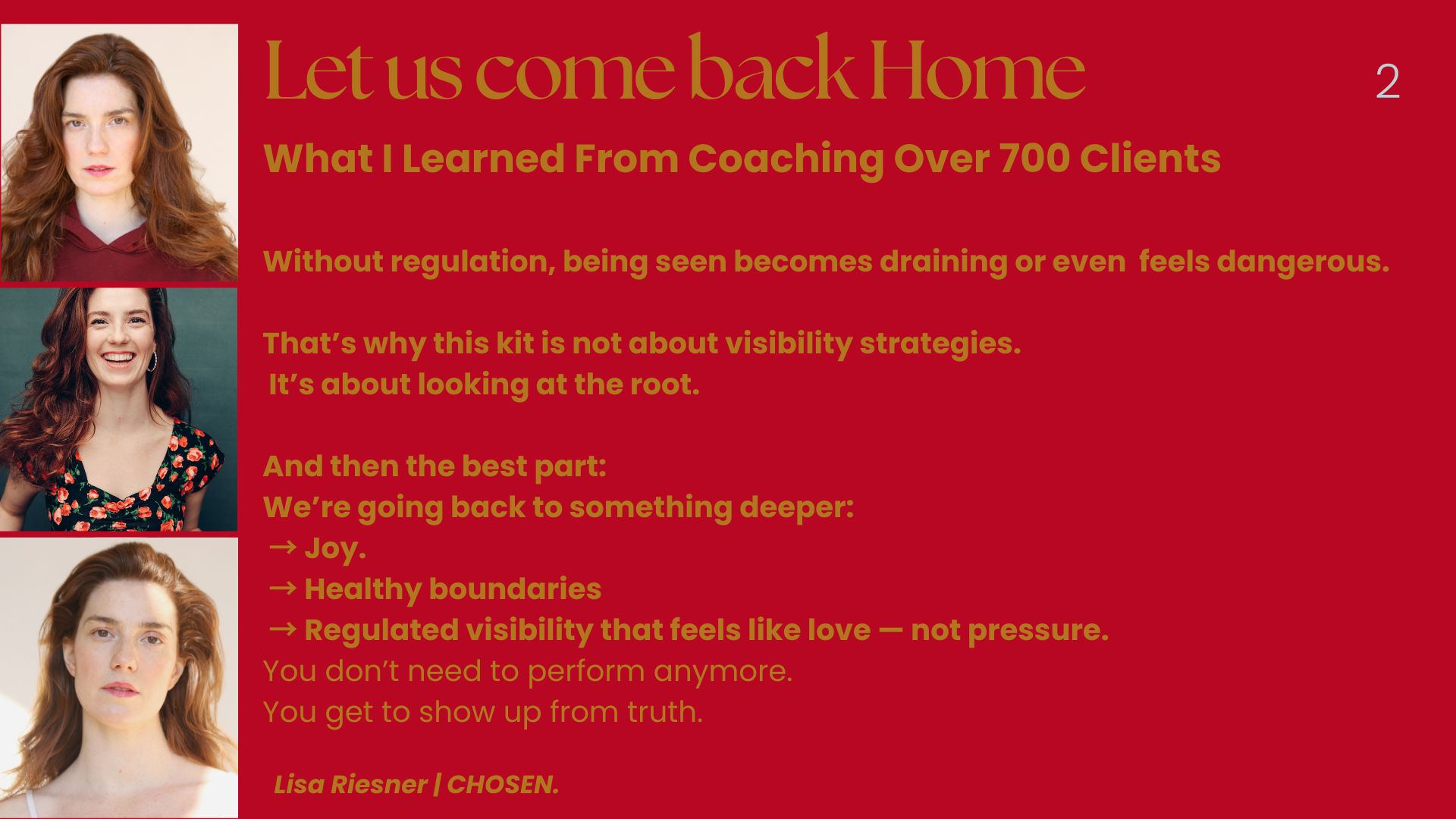 FULL START BUILDING –Legacy Kit Your business begins from the inside out: Nervous system. Inner child. Belief work. Practical next steps. This kit holds your beginning. And it’s big.The CHOSEN. LEGACY KIT is your entry point into a completely different way of living, creating, and succeeding — from the inside out.I’m Lisa Riesner — your guide through the most powerful reprogramming work of my life. I’ve supported over 700 private clients, built a beach-based business while healing my nervous system, and helped thousands rewire their worth, visibility, and voice.Now I give you this kit — because you don’t have to wait anymore.